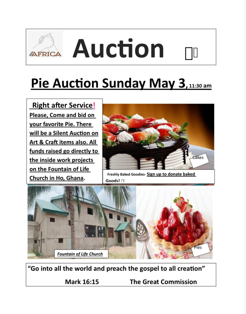 Come at Move City Church Sunday May 3rd 2026 at 11:30AM directly after service to take part in a fun way to help build a church in Ho, Ghana Africa. Come ready to bid on your favorite dessert. There is also a silent auction where you can bid on different arts and crafts items. Some of these items come from Ghana also. Move City Church, 200 North Ave, Sierra Vista Az.